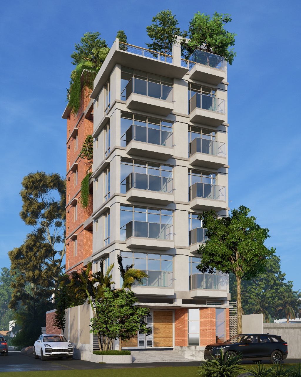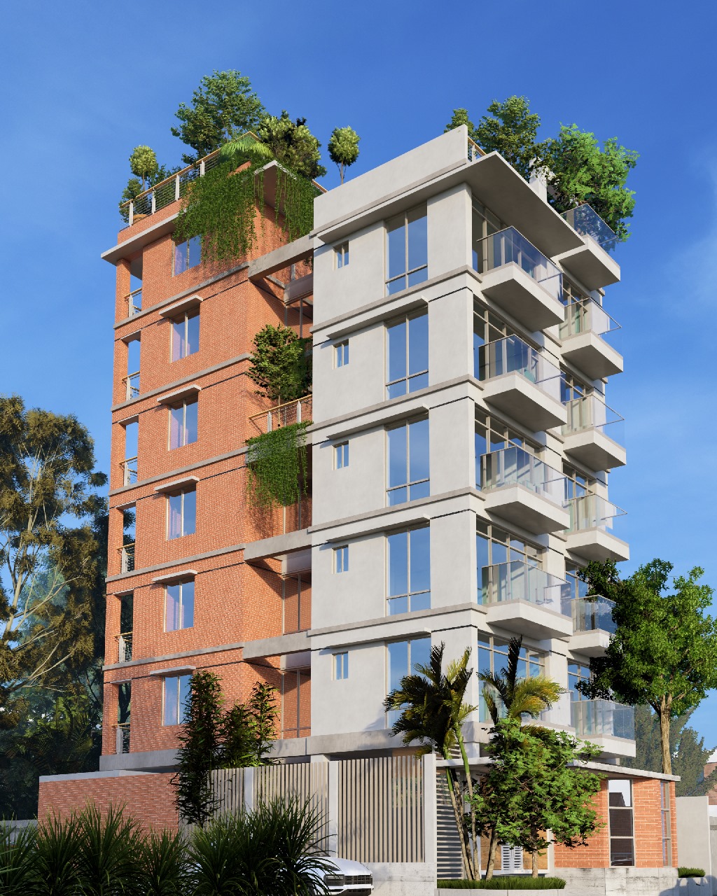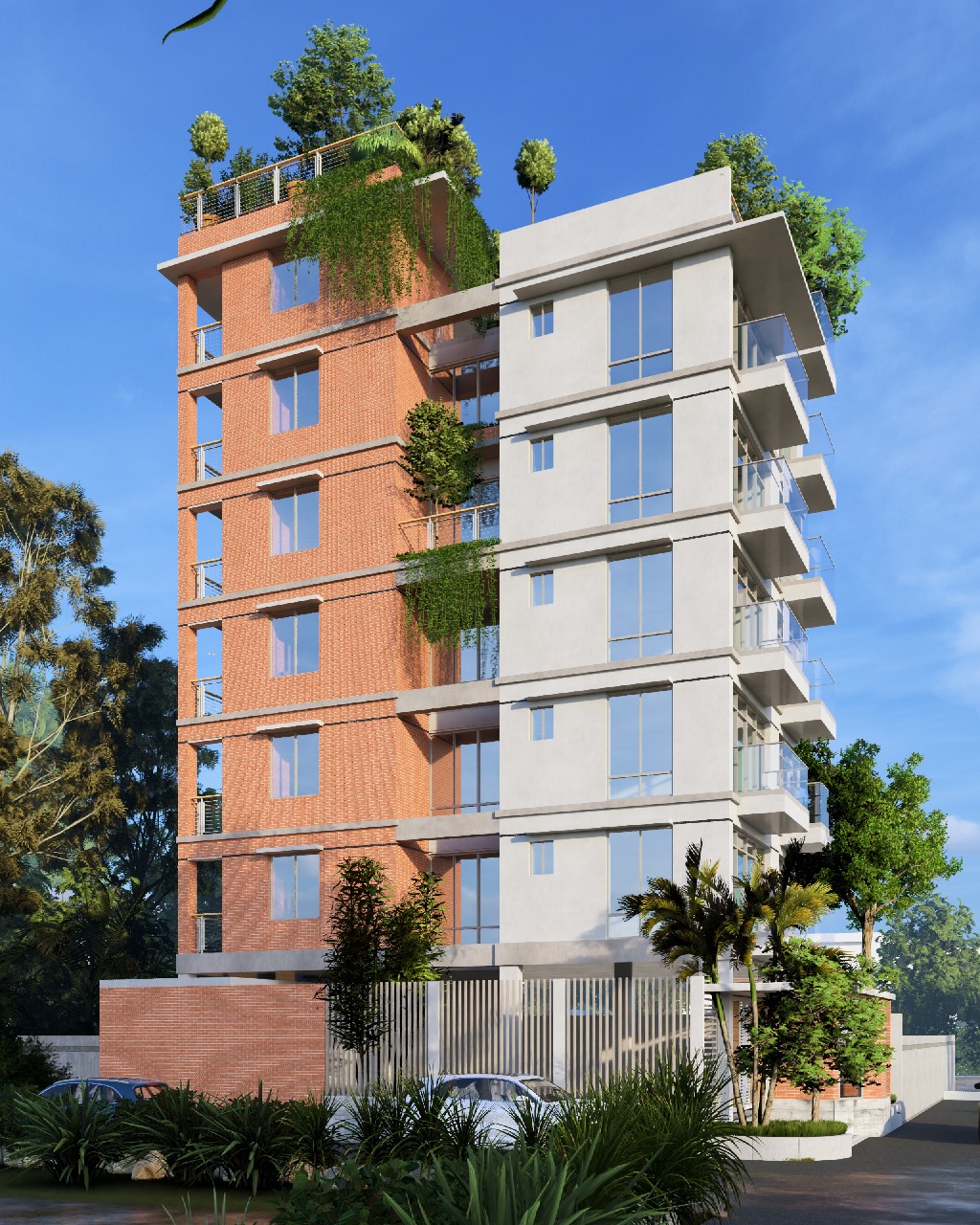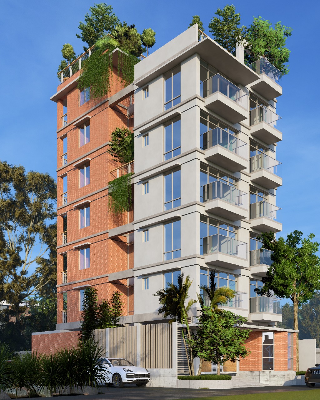 The structure is a harmonious blend of concrete and brick. The exposed brickwork is key to its aesthetic appeal, giving the building a distinct beauty that helps it stand out. Generous space has been allocated for gardening, intentionally fostering a connection between the home and nature.